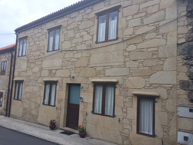 Se puede decir que el frente de esta casa está dividido en dos partes una parte cubierta de piedra que cubre tanto el primer como el segundo piso, esta.
